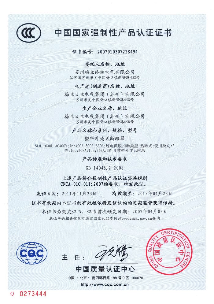 SLM1-630L塑殼斷路器資質(zhì)證書(shū)