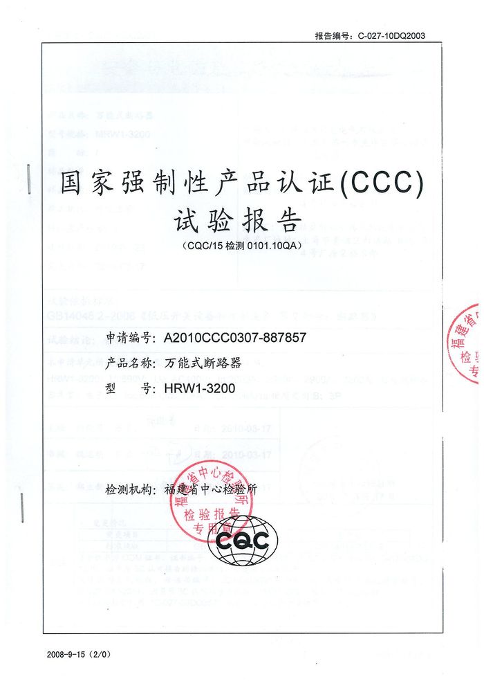 MRW1-3200萬能斷路器資質(zhì)證書