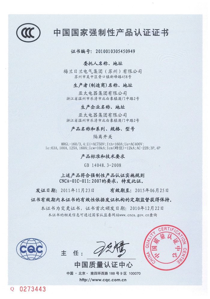 MRGL-160隔離開關(guān)資質(zhì)證書