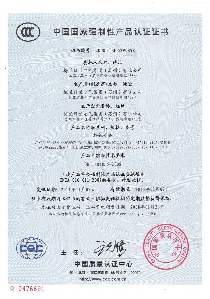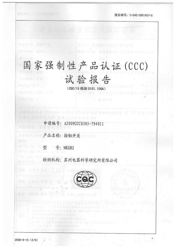 MRXB2按鈕開(kāi)關(guān)資質(zhì)證書