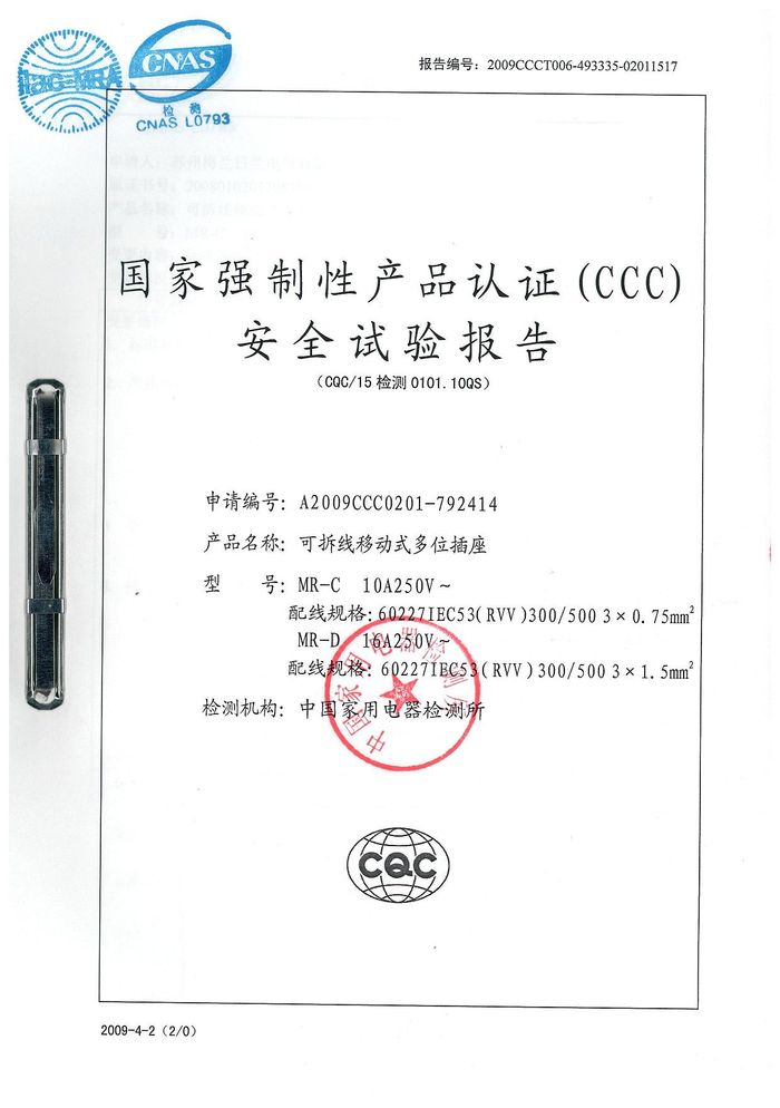 MR-C排插資質(zhì)證書(shū)
