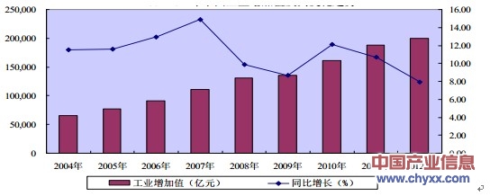 2004-2012年中國(guó)工業(yè)增加值及其變化趨勢(shì)