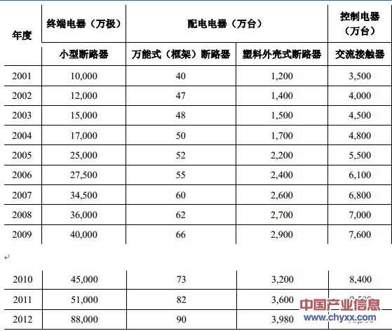 根據(jù)中國(guó)電器工業(yè)協(xié)會(huì)的統(tǒng)計(jì),2001 年至 2012 年主要低壓電器產(chǎn)品的產(chǎn)銷(xiāo)量呈逐年上升趨勢(shì),低壓電器產(chǎn)品保持較快速度增長(zhǎng),終端電器、配電電器、控制電器產(chǎn)量復(fù)合增長(zhǎng)率分別為 21.86%、11.41%、10.50%,今后較長(zhǎng)一段時(shí)間內(nèi)我國(guó)低壓電器市場(chǎng)容量仍會(huì)穩(wěn)步增長(zhǎng)。