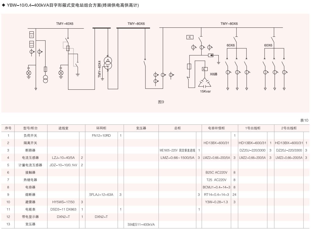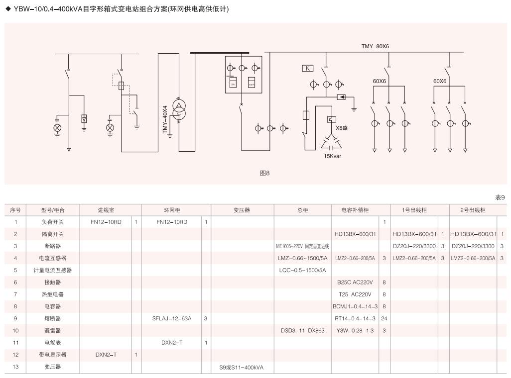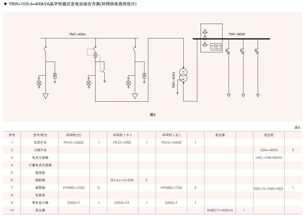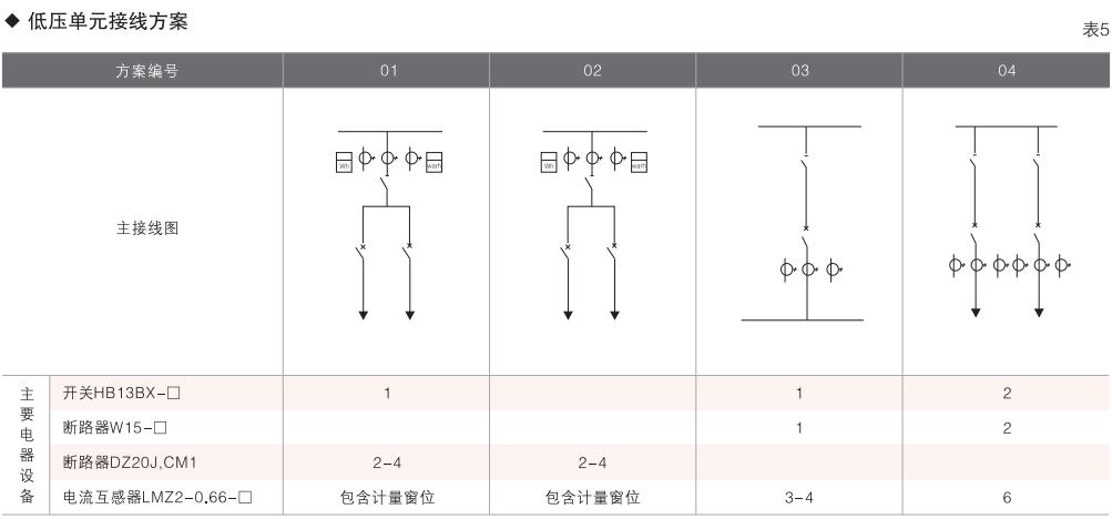 本變電箱高、低壓單元均采用組合式柜.按所需要接線組合成高、低壓配電系統(tǒng)常用高、低壓柜的接線方案均可選用,同時(shí)高壓單元又可組合成環(huán)網(wǎng)型式等。(見表4、表5)