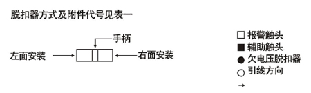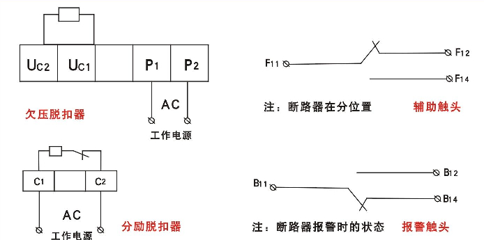 附件裝置分內(nèi)部裝置和外部裝置:內(nèi)部裝置有分勵(lì)脫扣器、欠電壓脫扣器、輔助觸頭、