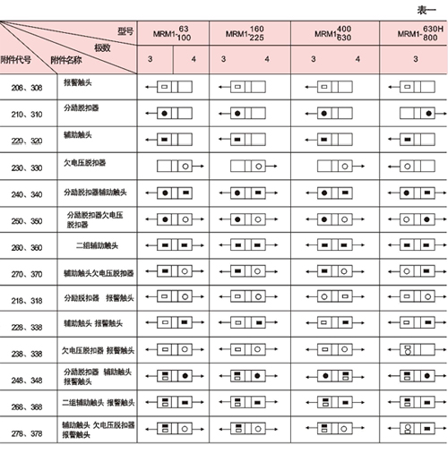 對(duì)MRMl-400、MRMl-630及MRMl-800其中248、348、278、378規(guī)格中輔助觸頭為一對(duì)觸頭(即一常開、一常閉),268、368規(guī)格中的輔助頭為三對(duì)觸頭