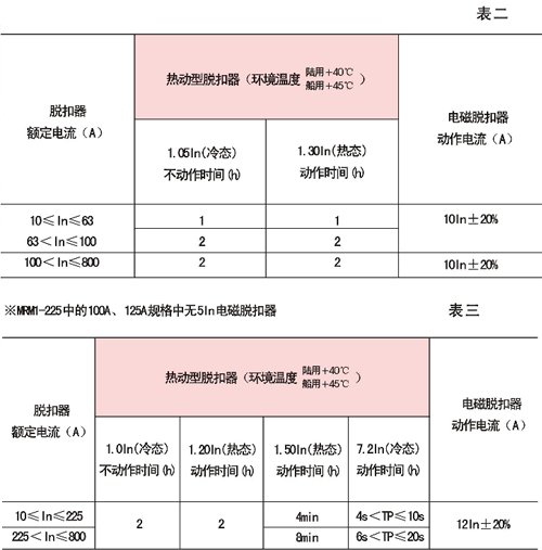 斷路器熱動(dòng)型脫扣器具有反時(shí)限特性;電磁脫扣器為瞬時(shí)動(dòng)作,特性見表二(配電用)及表三(保護(hù)電動(dòng)機(jī)用)