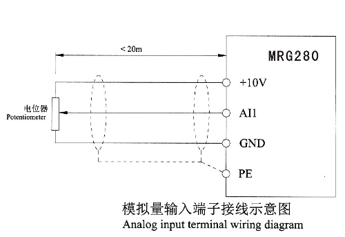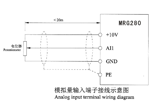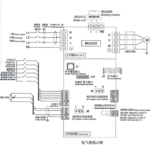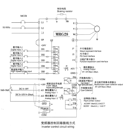 注:所有MRG280系列變頻器控制回路接線方式一樣,上圖為三相380V變頻器接線示意圖,端子◎表示主回路端子,0表示控制回路端子。
