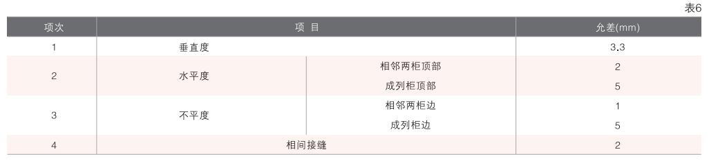 ◆裝置單獨(dú)或成列安裝時(shí),其垂直度以及柜面不平度和柜間縫隙的偏差應(yīng)符合表6規(guī)定。